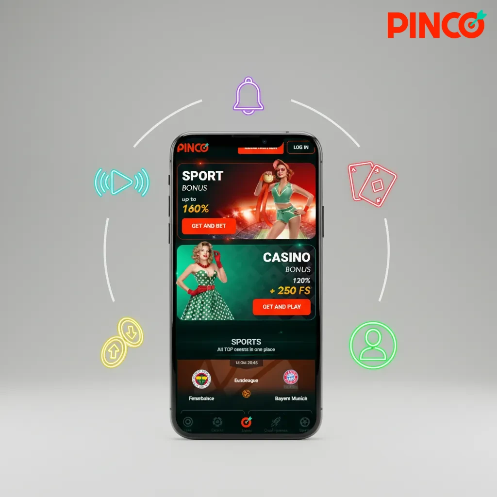 La PWA Pinco charge vite, affiche des menus clairs et un bouton de dépôt visible sur toutes les pages. Le sport, le casino et les promos sont accessibles en un seul geste.
